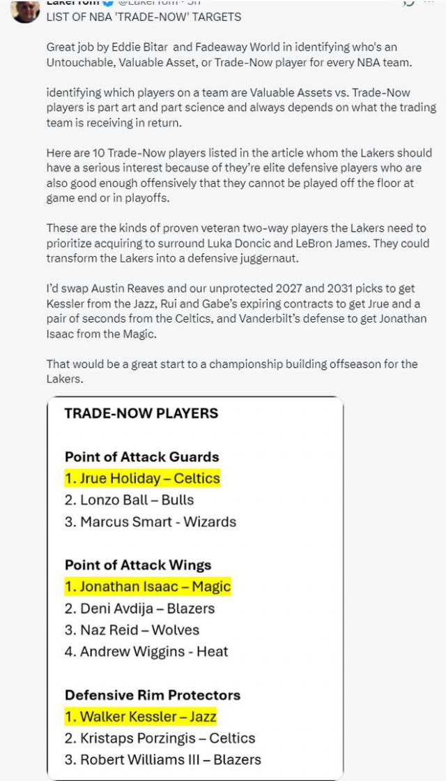 湖媒 Laker Tom 为了解释为什么爵士的凯斯勒,魔术的艾萨克,凯尔特人霍勒迪适合湖人,写了一条特别长的推文。
