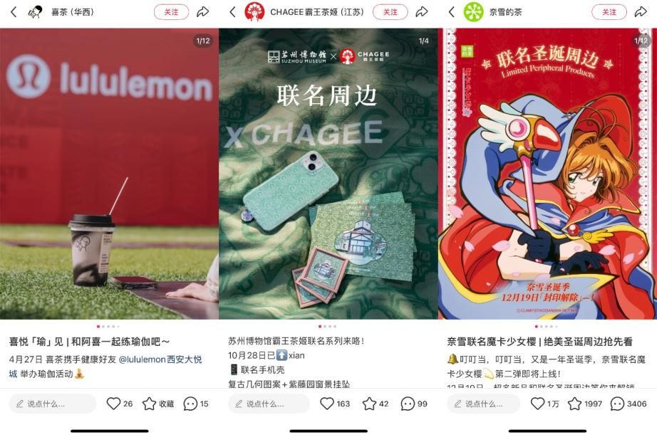 其次,联合品牌方向更加多样化,包括影视综合、动画、游戏等领域,品牌找到了更适合自己的联合品牌解决方案和路线。茶聚焦潮流品牌,突出文化调性和品牌价值;霸王茶姬倾向于与文化创意IP合作,巩固东方茶的形象;奈雪的茶聚焦女性IP,深化用户粘性。