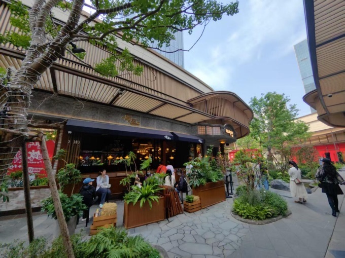 目前很多店铺还处于围栏状态,尤其是一楼。除了三两个时尚品牌,比如BAPE,一楼西区的品牌并不多。餐饮是JLC的亮点,多层布局,一店一色,多品牌第一店,兼顾新鲜度和丰富度。屋顶花园的街头餐饮,结合屋顶景观和餐饮场景,采取了不同的方式,为低密度户外用餐提供了一个很好的休闲场所。