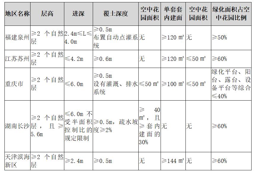 比如空中花园一般要求不少于2个完整的开放面,开放面没有围墙、结构柱、凸窗等。建筑高度不少于2层自然层,高度不少于5米,覆土深度一般不少于5米。