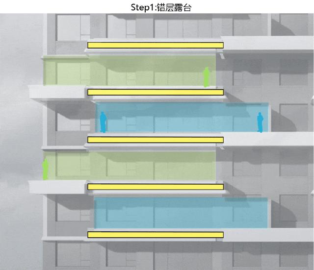 一些项目通过放弃一些公寓类型的空中花园来避免面对面的问题。比如武汉第一个四代住宅试点项目,只在最终户型设置空中花园,而中间户不做这个设备。以下是118㎡房间类型,奇偶层分别采用卧室出挑和入户空中花园出挑的设计。