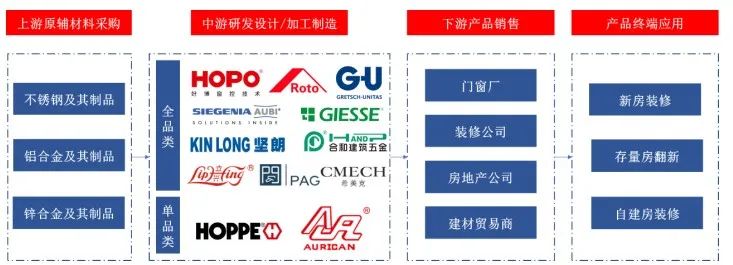 门窗五金行业的上游主要是锌合金、铝合金、不锈钢等金属制品的生产企业。中游企业负责产品的R&D、设计和制造。下游客户主要是门窗厂、装修公司、房地产公司、建材贸易商等。产品主要用于新建和现有住宅。