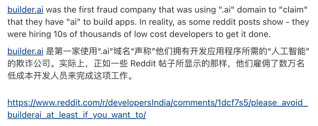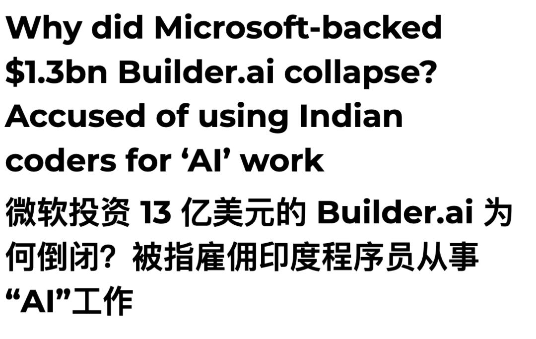 原因是Builder.ai被曝发布官方声称的AI编程,事实上,它是一个“人肉代码工厂”,由一群印度程序员组成。