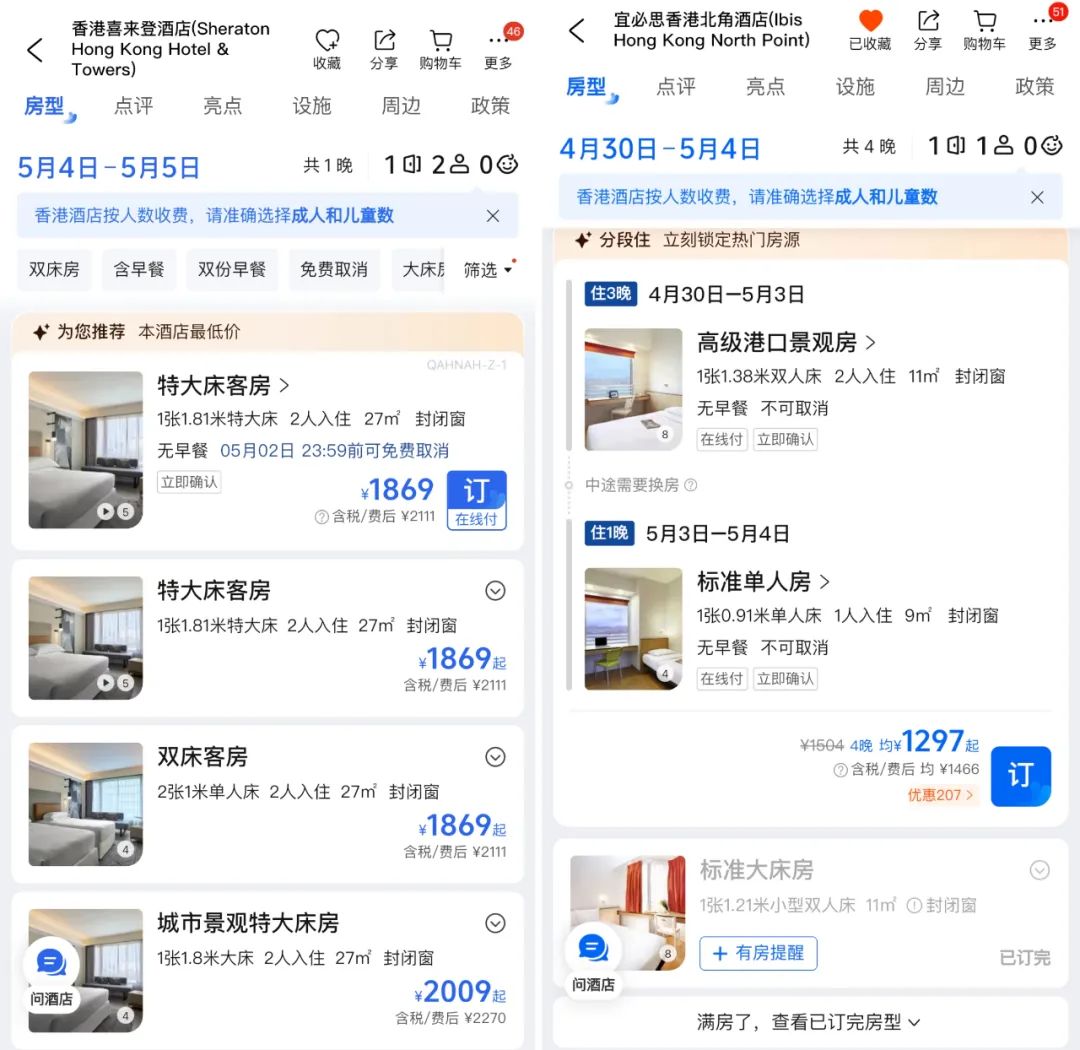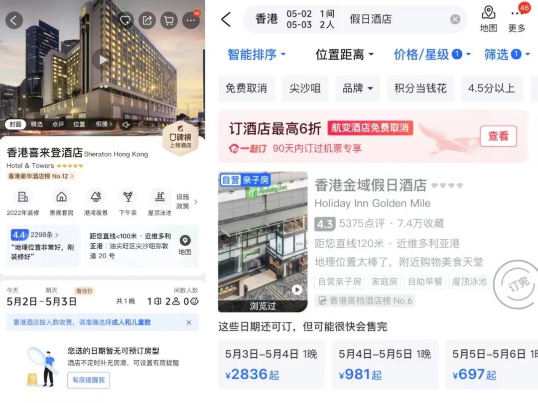 闻旅还试图了解香港高星级酒店在五一期间的价格。五月二日,香港喜来登酒店、香港金域假日酒店已满。