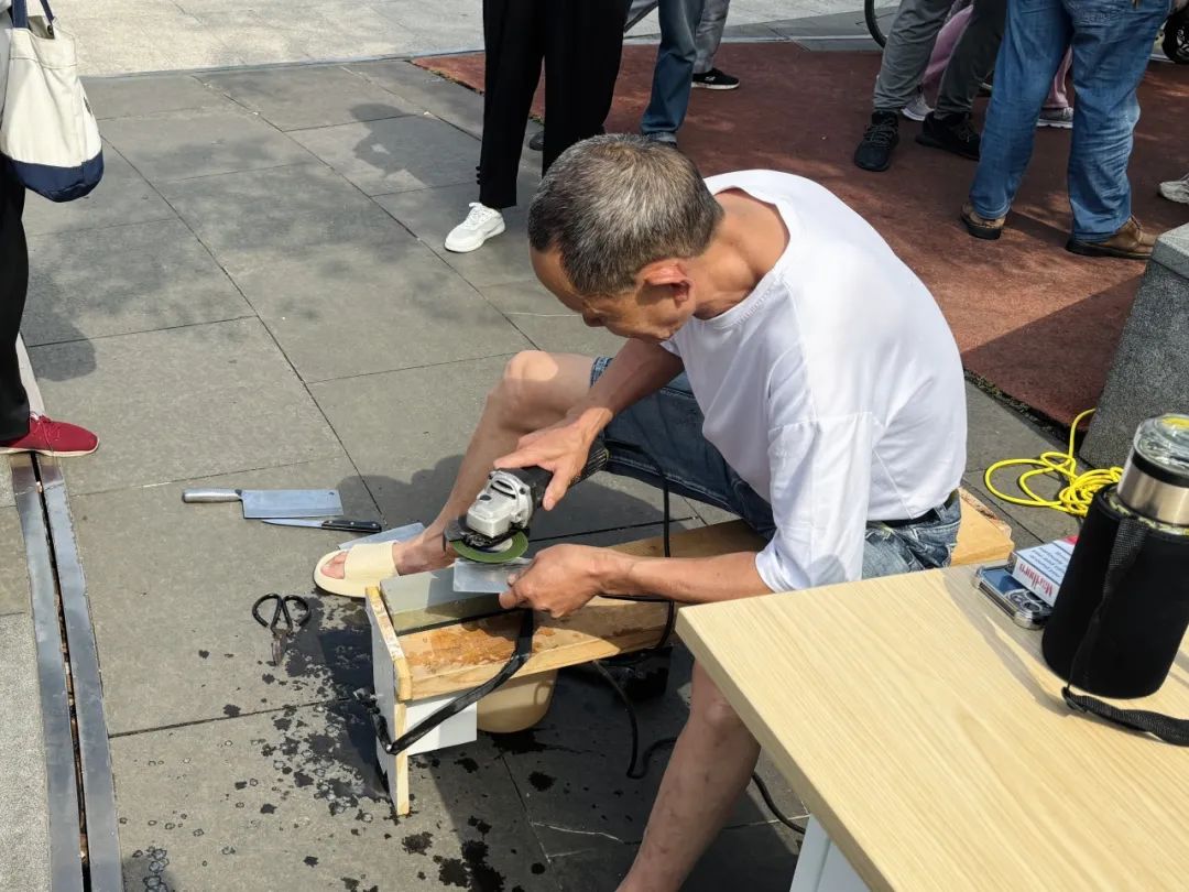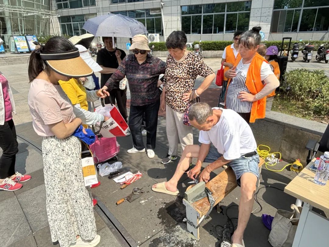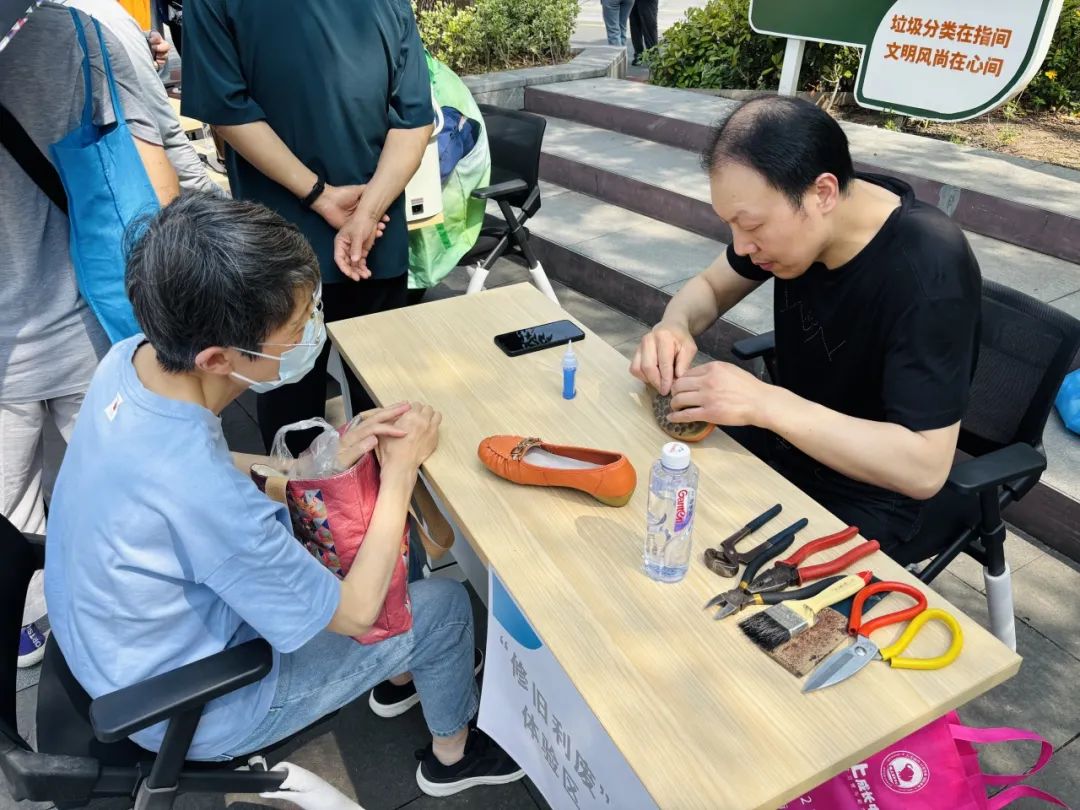 “修旧利废”体验馆的“生意”正在蓬勃发展,来修复的居民络绎不绝。四位大师组成了“修补天团”,现场演绎了磨刀、修小家电、修鞋、编织等绝技。旧工艺与新理念相撞,“伤害”物品再次“复活”,不仅让居民体验到了传统工艺的魅力,也让“用自己的长处”的智慧在新时代焕发光彩。