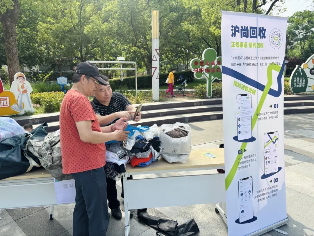 会场和社区的沪尚回收点也排起了长队,居民们纷纷将家中的旧物带回收。工作人员耐心指导居民使用沪尚回收小程序下单,可以享受上门服务,不用离开家就可以动手奉献环保力量。现场旧衣服、塑料制品、废纸箱等物品分类回收,资源集中处理再利用。