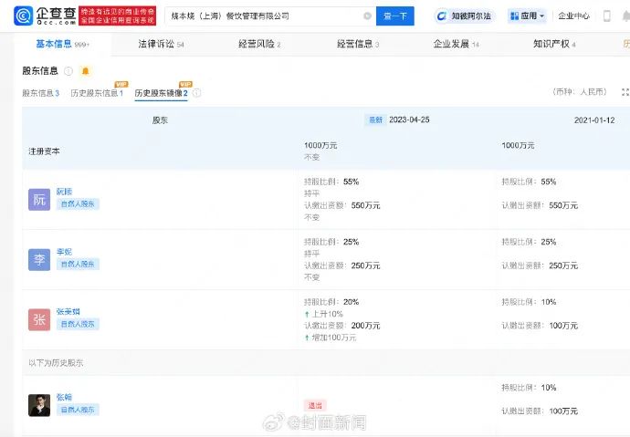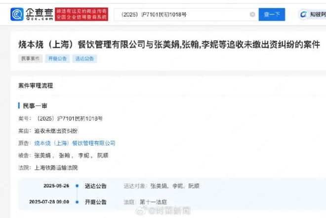 天眼查APP显示,5月26日,法院将送达烧本烧(上海)餐饮管理有限公司、张翰等案件开庭传票,并于7月28日在上海铁路运输法院开庭审理。数据显示,该公司成立于2021年1月,注册资本1000万元,张翰持有10%的头寸,并于2023年4月撤出。