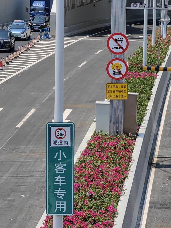 为了避免因为习惯驾驶极高的车辆和其它禁行车辆而误入隧道,隧道东西两侧限高限行标志及标线细节请多加注意。