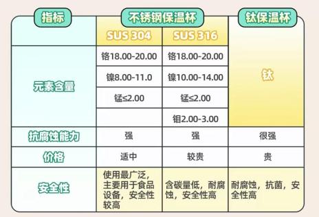 目前304或316系列不锈钢广泛应用于保温杯内胆,部分采用钛金属材料,不同材料各有优缺点。不锈钢和钛金属都需要满足我国相关标准的要求。