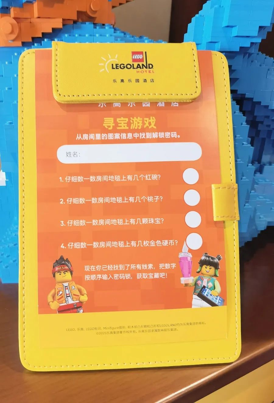 值得一提的是,每个房间都有一个“宝箱”。就像打开盲盒一样,每个盒子里的“宝藏”都不一样,是酒店免费送给孩子的礼物。但在此之前,孩子需要和父母一起完成“寻宝游戏”,比如“数一数房间摊位上有多少寿司”、“数一数房间摊位上有多少银剑”、“数一数房间摊位上有多少金色高脚杯”等。只有通过亲子互动获得一组数字,才能打开宝箱的密码锁,成功获得“宝藏”。