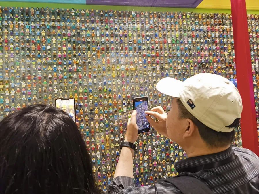 在去电梯的路上,一面人仔墙是一个亮点。墙上展示了4330个不同的小男孩,他们是从来自世界各地和世界各地的玩家那里挑选出来的。工作人员还提醒,在这个密密麻麻的小男孩中,隐藏着三个“小惊喜”,分别是全金小男孩、法师小男孩和财神小男孩。游客不妨试着寻找它们。所以,墙边还挂着两个超大的放大镜,供大人小孩一起仔细寻找。