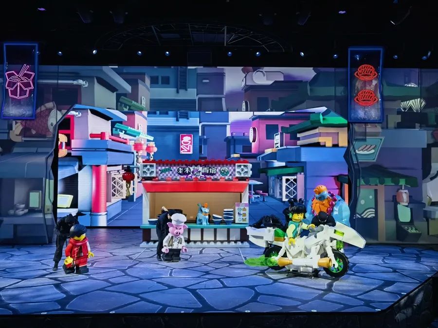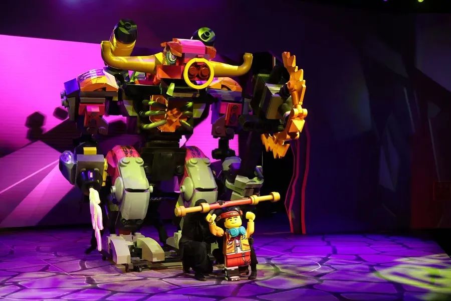其中,一部20分钟左右的木偶剧《悟空小侠花果山降魔》,穿着黑色衣服的工作人员通过超大屏幕和声、光、电的效果,依次出现在乐高形象中,包括齐小天、朱大厨、红孩、牛王默、铁扇公主等。,而且一场又一场的打斗非常热闹。原来这部剧是对“中国传统故事”的现代诠释,讲述了齐小天在送外卖的路上捡到金箍棒,从而展开了一系列冒险故事,最终成功击败了牛王默,拯救了花果山。