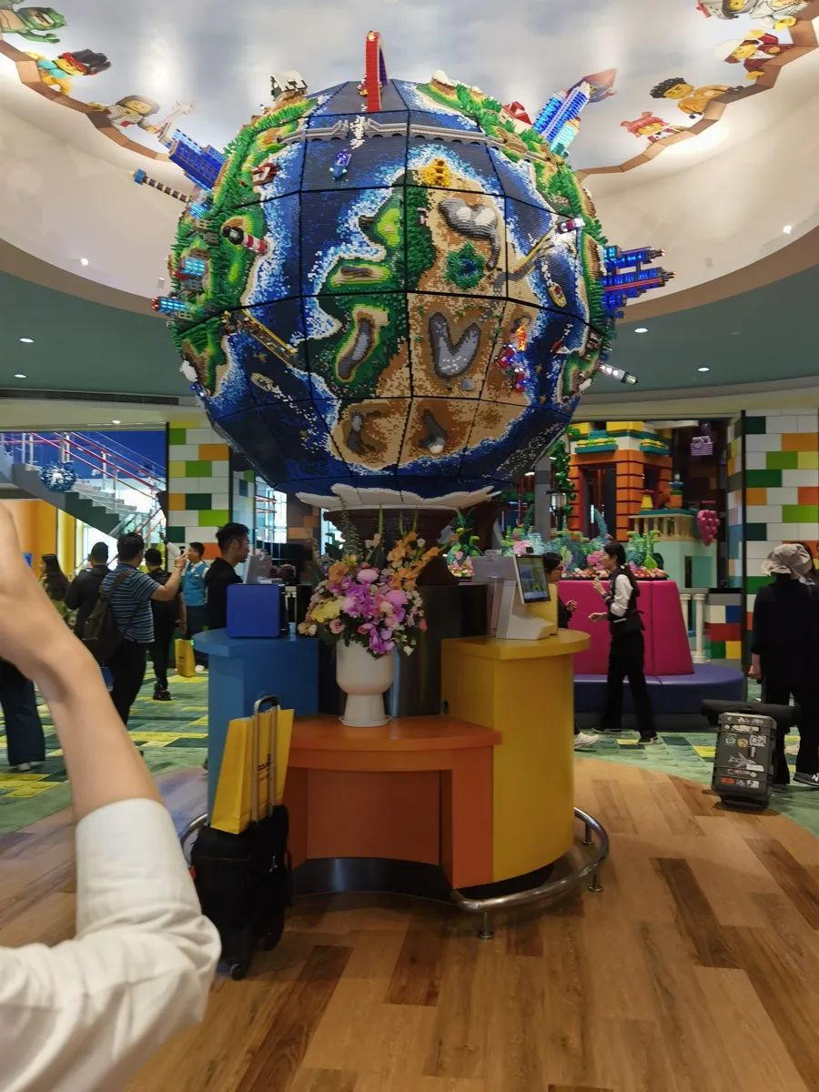 走进一楼大堂,被一个4米多高的“探险地球”设备所吸引,也是用乐高积木搭建的。地球表面分布着海洋、森林等地理特征,以及鳄鱼、风车等形象,凹凸有致,栩栩如生,向孩子们传达了关爱海洋和地球的环保理念。