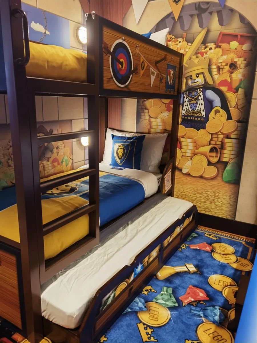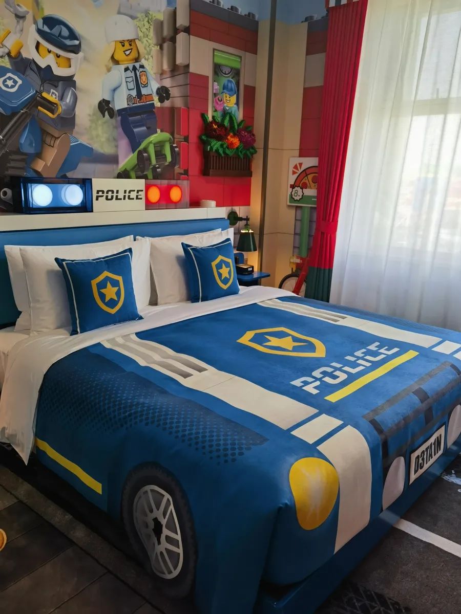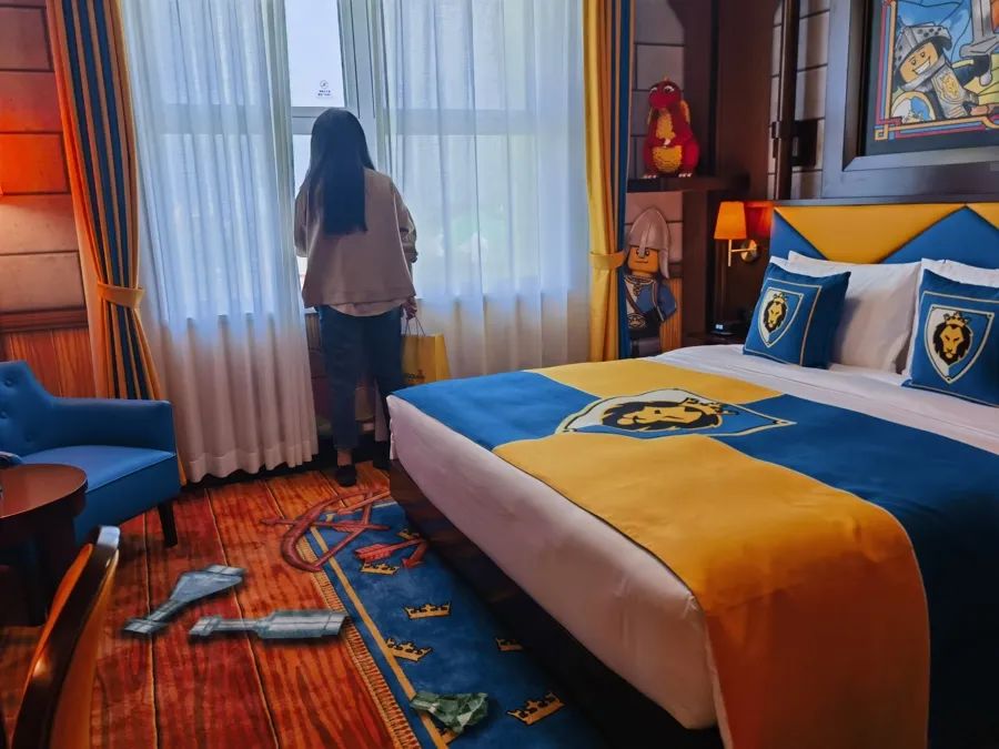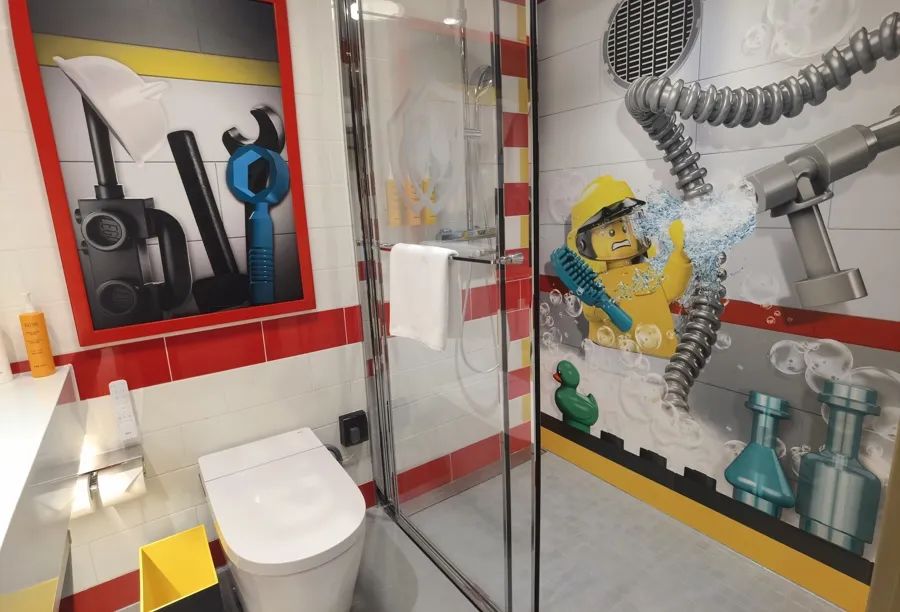 酒店的每一个细节都体现了“玩中住,住中玩”。工作人员带着记者参观了三楼、六楼、七楼不同主题的园林家庭房间。通过窗户,公园里的风景可以一览无余。内部结构布局基本相同。除了卫生间,还有一张大床和一张高低床,供家人和两个孩子入住。房间、墙壁、地板、被子、床单等颜色图案根据乐高城堡、乐高城市、乐高好朋友、乐高幻影忍者等主题进行装饰。即使是淋浴墙上也有主题图案,非常华丽可爱,整个房间就像一个童话世界。