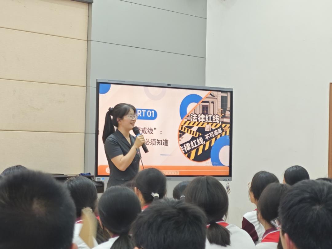“没有参加约架是犯罪吗?”“陌生网友想让你加微信,然后给你蛋派对的游戏皮肤。你能接受吗?”“好朋友强烈邀请你试试‘新电子烟’。你想试试吗?”在互动问答阶段,学生积极参与,现场气氛热烈,引导学生远离违法犯罪,用法律保护自己美好的青春。
