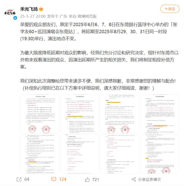 原定于2025年6月6、7、八日在东莞银行篮球中心举行「张学友60 东莞站巡回演唱会」,将推迟到2025年8月29日、30、同一时间段(1911日:30)表演地点不变。对于来东莞市外观看表演的观众,将制定相应的补偿方案,因为表演延期造成的相关损失。