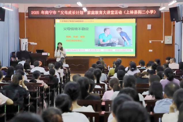 5月23日晚,2025年南宁市“父母成长计划”家庭教育讲堂活动走进上林县大丰街第二小学,由南宁市妇女联合会主办,上林县妇女联合会、上林县大丰街第二小学、南宁市家庭教育协会承办,近200名家长和学生到场倾听。