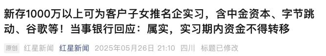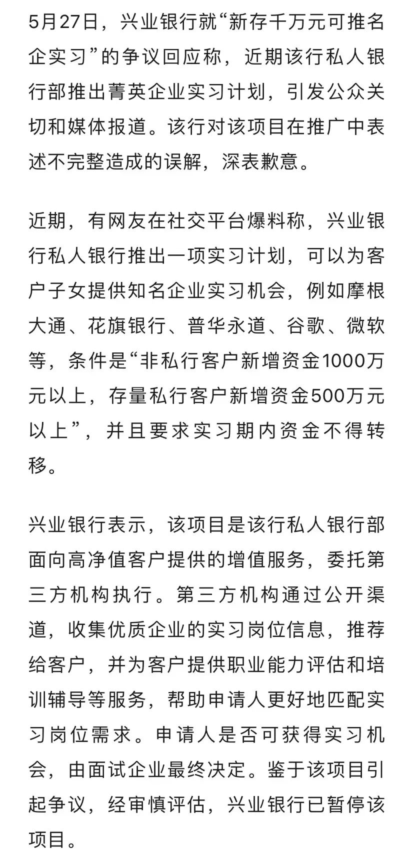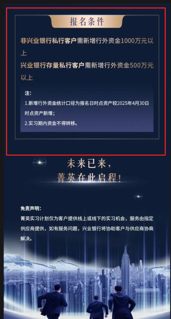 有网友爆料称,兴业银行私人银行最近推出了一项名为“2025精英实习计划”的活动,是专门为高净值客户和孩子量身定制的机会,可供选择的企业也是各行各业的知名企业。 当然,参加这个活动是有门槛的。非兴业银行的私人银行客户需要增加1000多万的外资,而兴业银行的私人银行客户需要增加500万的外资,实习期间资金不允许转移。