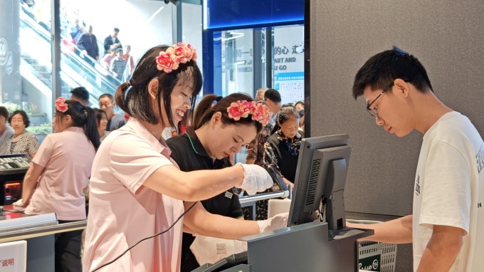 服务升级更显人文关怀:客户休息区配备身高检测仪、血压仪等健康设备,提供免费充电宝、饮用水、微波炉服务1小时。海鲜柜台提供帝王蟹泡沫盒包装,肉禽柜台免费为客户提供切丝、去骨、绞肉等服务,为客户节省时间和精力。收银区按照包装过程精确分类产品,并为低血糖客户和儿童添加爱心糖块免费使用。