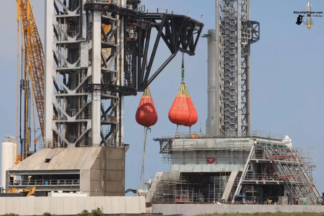 最近,二号发射台的“短筷子”已经安装好,并进行了负荷检测。工人们把四个装满水的巨大袋子挂在上面,每个袋子重约100吨,模拟抓火箭时的巨大负荷。 。测试看起来进展顺利 。