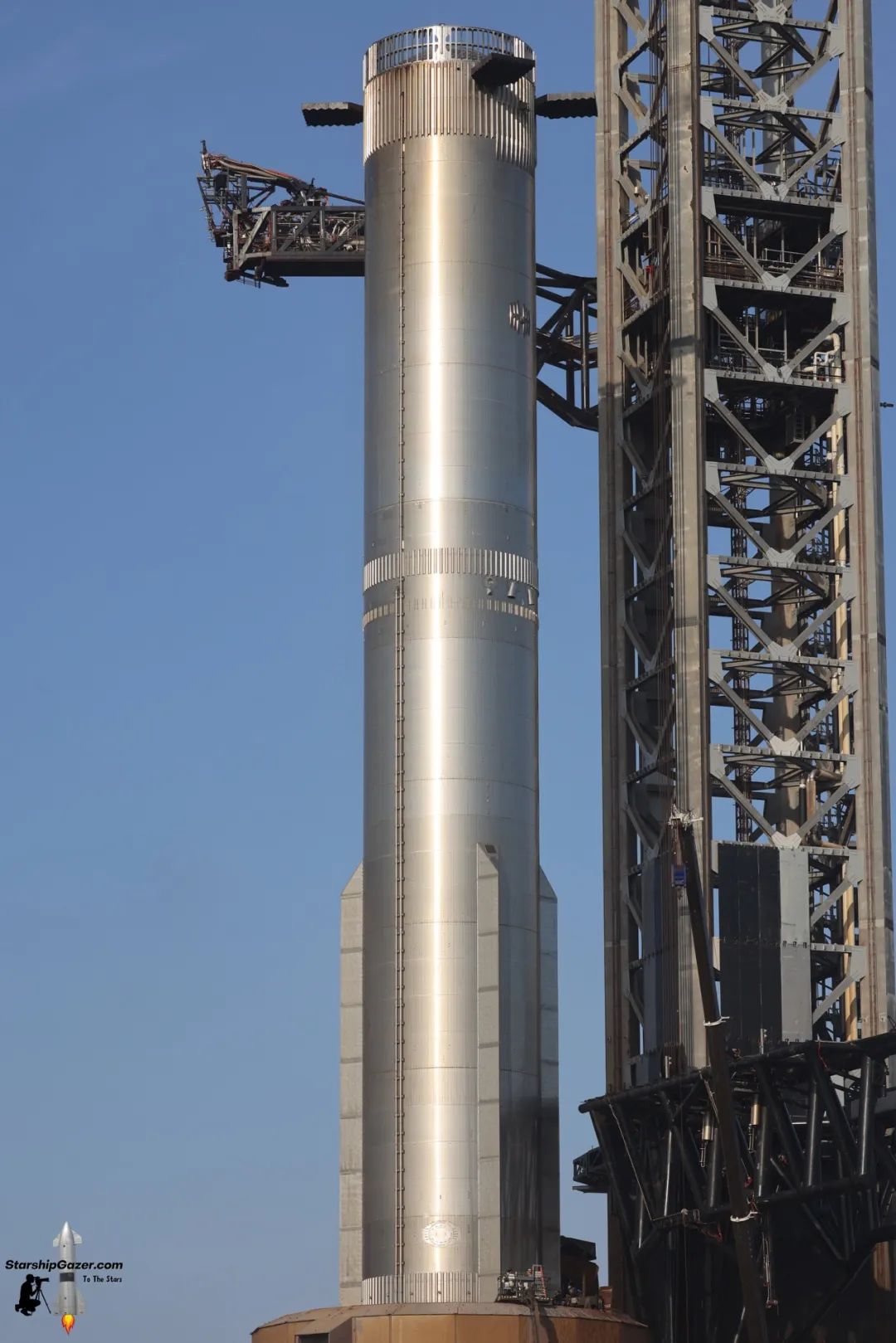 星舰B14级再次站在发射塔旁,顶部有明显的烤蓝痕迹,是第七次试飞一级和二级分离时二级尾焰燃烧的结果。 | StarshipGazer