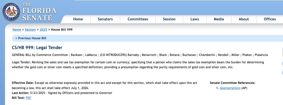 新法案确立了贵金属在佛州支付系统中的法律地位。部分金银硬币在满足特殊条件(标注重量、纯度和原产地)后,将被视为法定货币,同时免征销售税,允许自愿用于交易,并建立其保管和支付方式的监管体系。该法案将于2026年7月1日正式生效。
