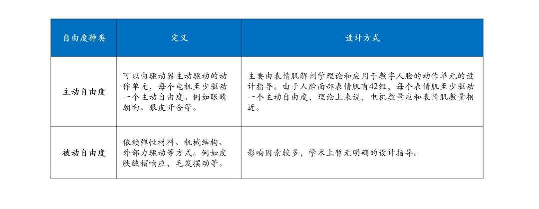 机器人表情头的自由可以分为主动自由和被动自由,主动性自由主要由表情肌解剖学理论和应用于数字人脸的动作单元的设计指导组成。目前还没有明确的设计指导。