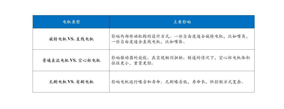 选择表情头电机的核心关注点是推力/扭距(大)、速度/速度(快)、噪声(小)、尺寸(小)、重量(轻)。下表显示了不同电机对表情头性能参数的影响:
