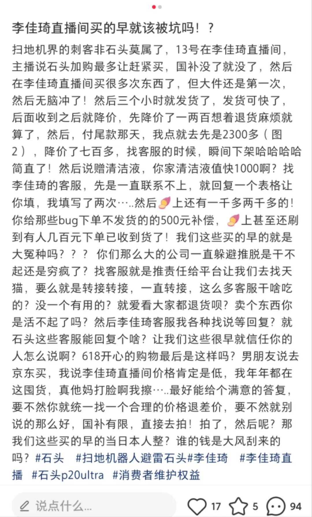 价格乌龙不是大促销期间的“偶然事件”,而是当事人的“信任危机”。但这毕竟不是更严重的“虚假广告”。所以对于主播和品牌来说,即使是退差价、发红包补偿等措施,对于石头科技和李佳琦来说,也只是“脱一层皮”。
