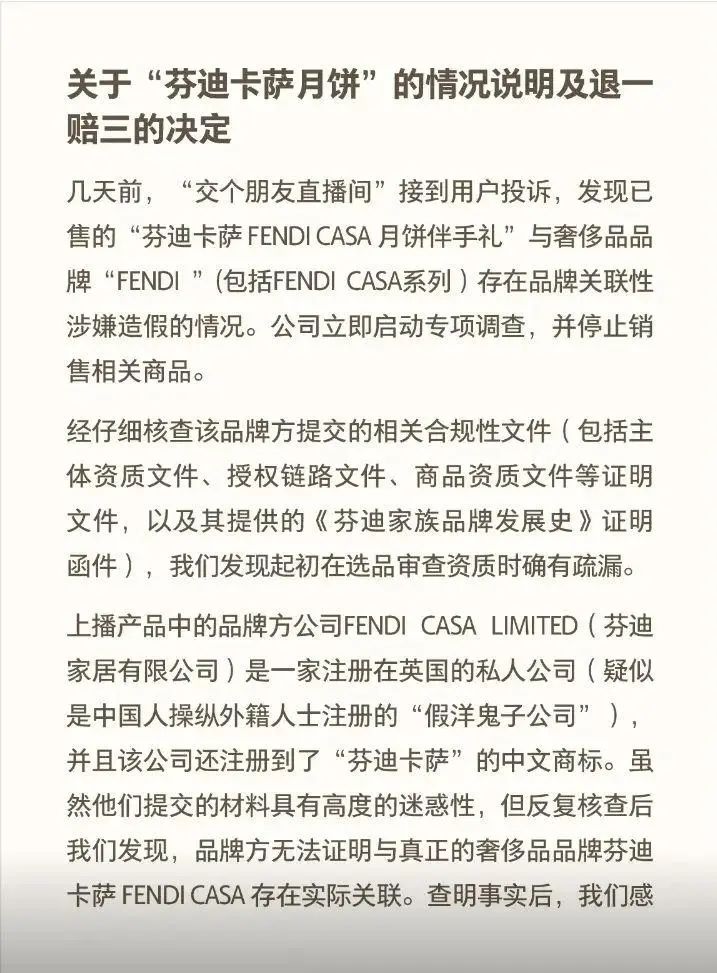 但是经过一段时间的销售,经过反复审查,“交朋友”发现品牌所有者无法证明芬迪卡萨FENDI与奢侈品牌。 CASA 实际上是有联系的。因此,这个月饼存在相关性涉嫌造假的情况。最终这个产品在交朋友的直播中下架。