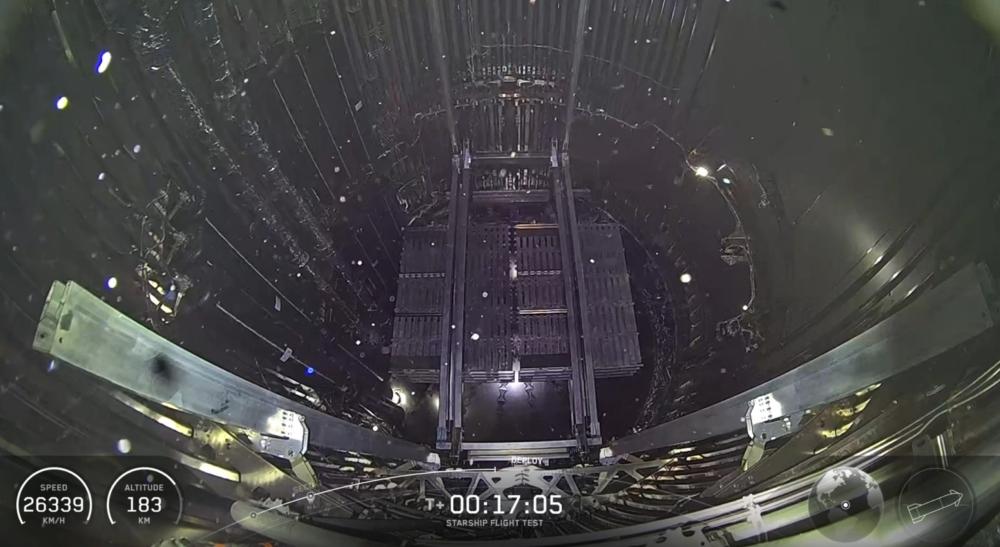 1)飞船首次有效载荷部署,模拟器包括8颗星链卫星(像飞船一样在亚轨道上飞行,再次进入时烧毁)
