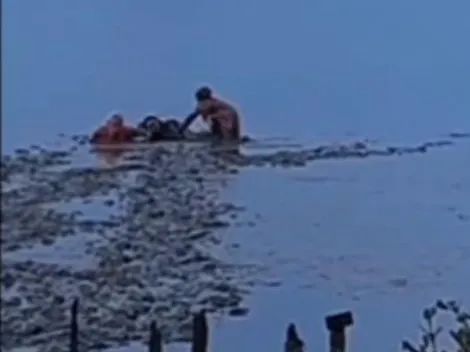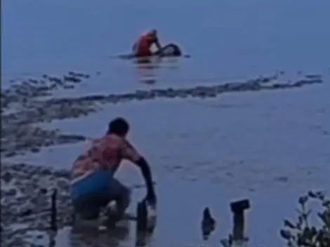 看到海水慢慢上涨,落水的人还在向海中央飘去。迫不及待的唐先生迅速卸下运动器材,跳进污泥,艰难地走向海中央。当他到达陈先生的位置时,他“几乎不能移动他的腿”。