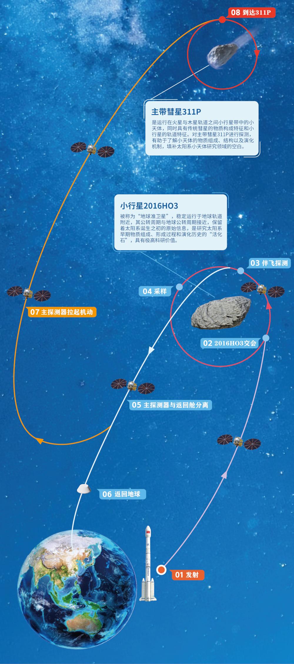 取样后,探测器将航行约7个月后返回地球周边。主探测器与返回舱分离。前者继续带着彗星311P进行检测任务,后者带着行星样品进入大气层,降落在预定的着陆场。