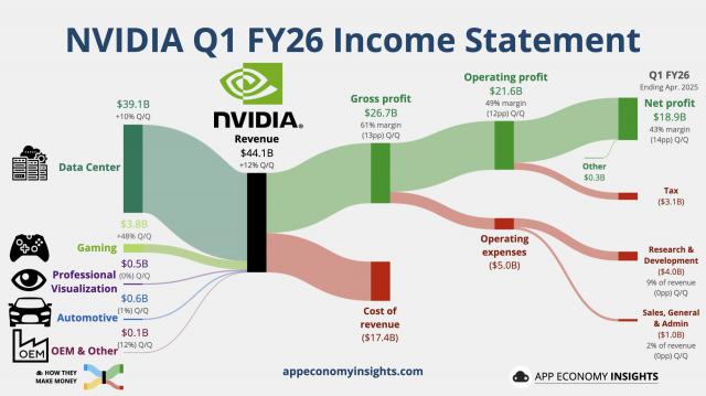 营收:第一季度营业收入 441 亿美元,同比增长 分析师期望的69% 432.9 亿美元,英伟达自己引导自己。 421.4 亿至 438.6 亿美元,前一季度同比增长 78%。