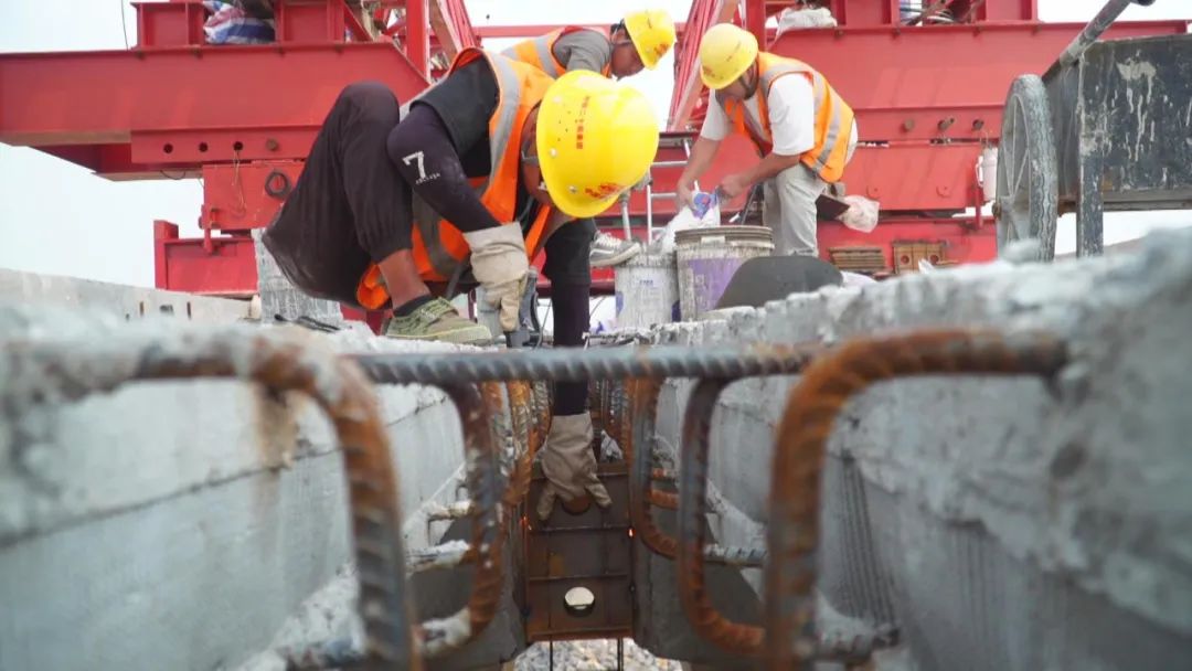 5月26日,铜陵江北港铁路专用线项目中铁20局庐江梁场顺利完成最后一片T梁浇筑任务,最终一车混凝土慢慢注入模板。