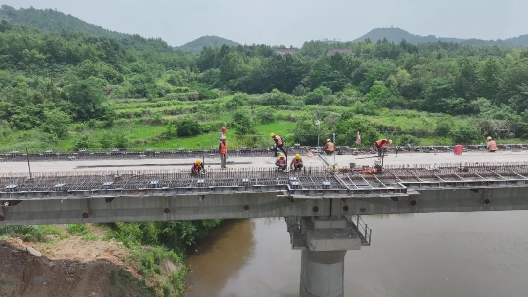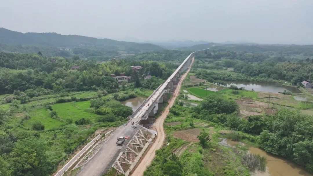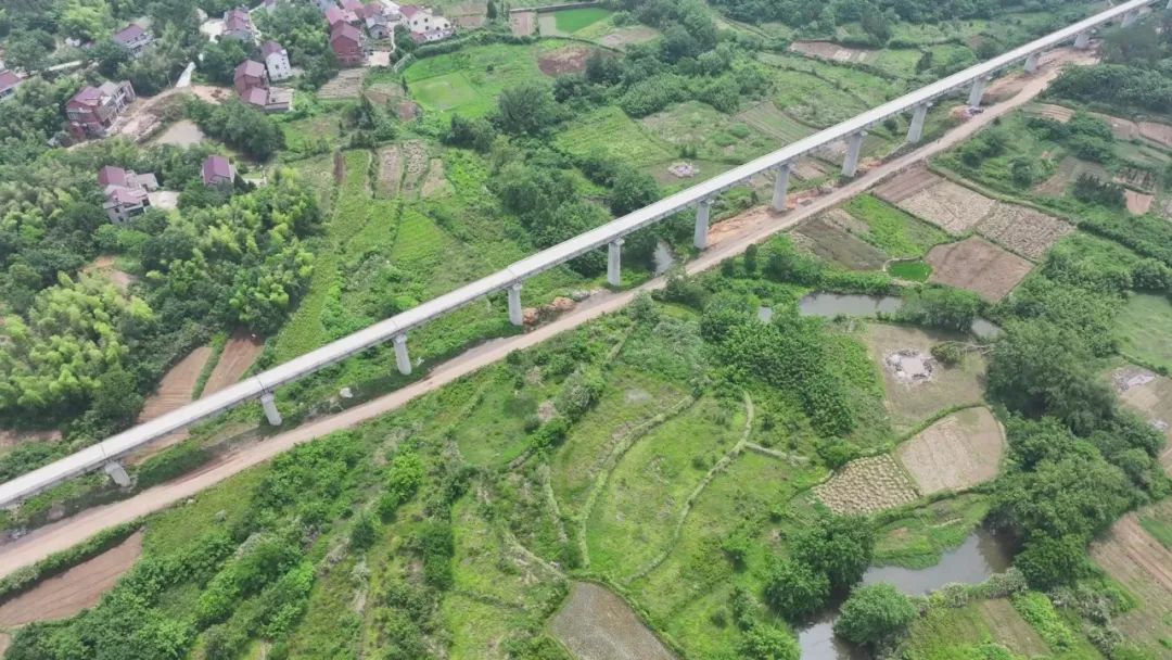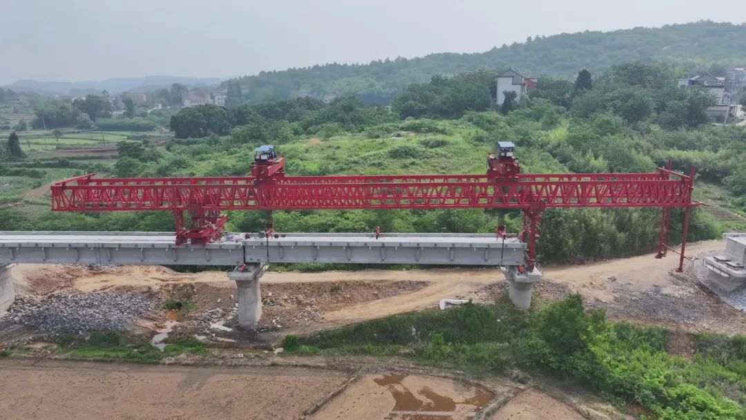 记者在明山镇田桥村铜陵港江北港区铁路专用线施工段看到,铁路路基已完工,大型架桥机正在搭建桥梁、焊接、灌浆等繁忙场景。