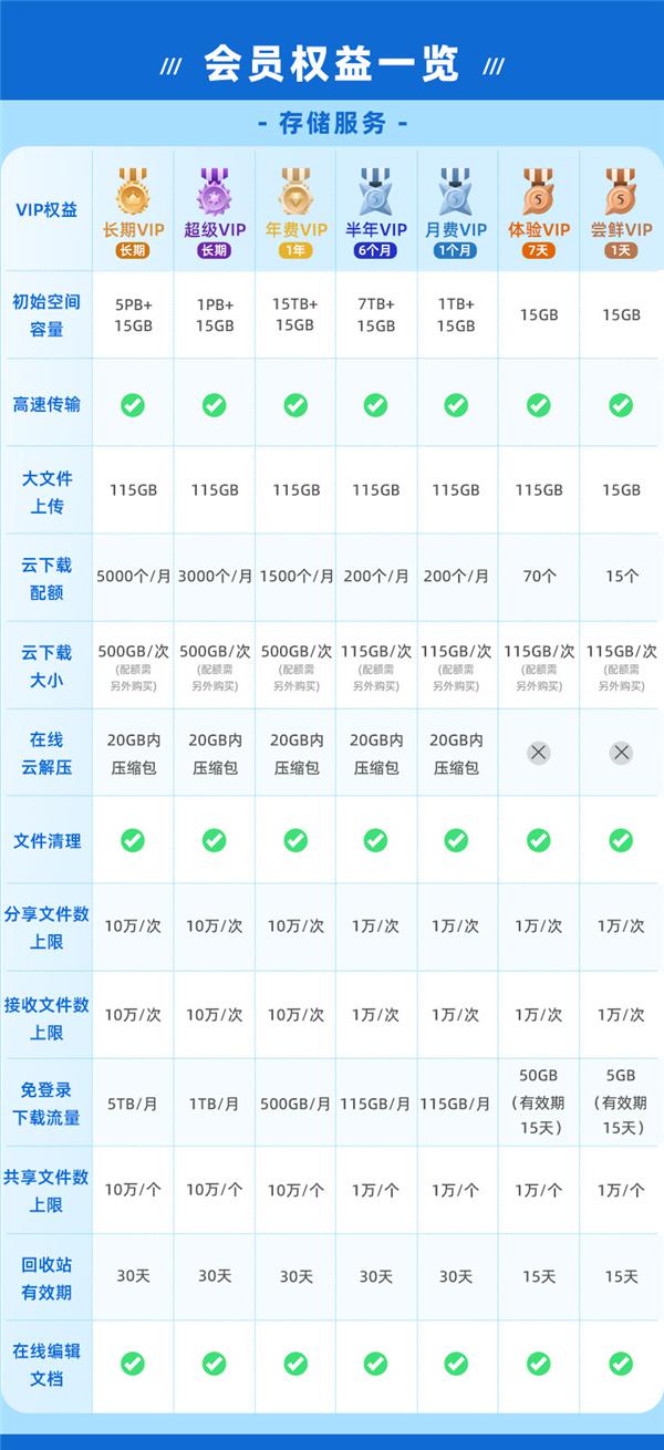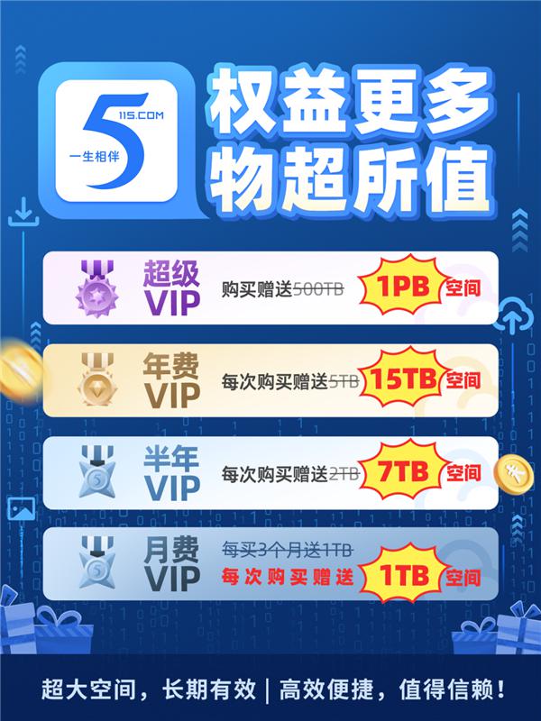 VIP权益调整115网盘:超级VIP1.15万元 购买时送1PB空间
