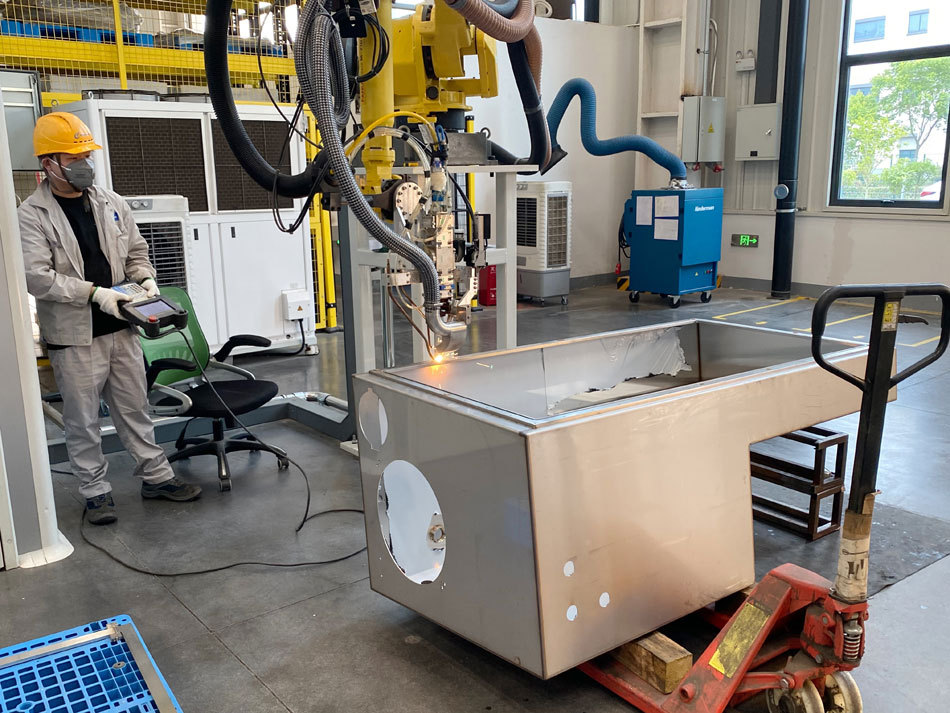 在米开罗那车间的焊接区域,工人们在机械臂和视觉定位技术的帮助下,利用企业开发的激光焊接技术进行真空箱激光焊接的现场操作。