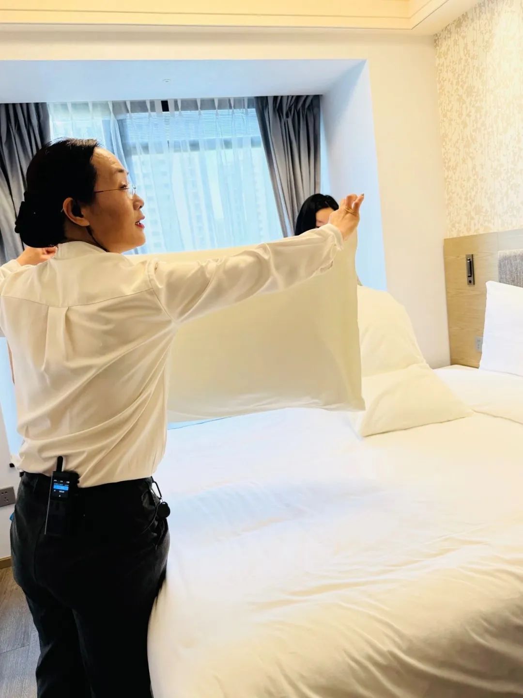 活动期间,公寓服务员耐心示范如何更换床单,分类清洗布草,并指导大家完成实际操作。