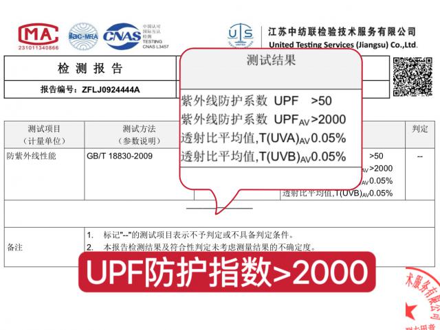(国家质检总局规定,UPF- 紫外保护系数>40,UVA- 紫外透过率<5% 当时,可以称之为防紫外线商品。)