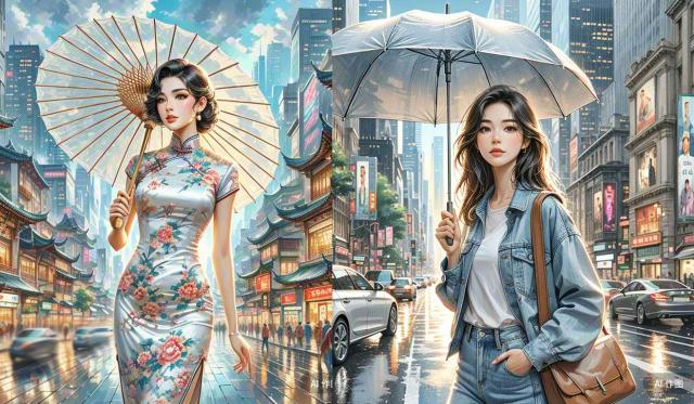 那些穿着旗袍和洋伞的现代女孩,以及今天在街上拿着防晒伞的都市美女,竟然在时间和空间两侧形成了一个镜像。这可能印证了达芬奇的谚语:“美是一种永恒的哲学,但媒体在不断进化。”