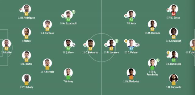 切尔西(4231):12- 约根森;27- 古斯托(46 ’ 24- 詹姆斯),23- 查洛巴,5- 巴迪亚西勒(61 ’ 6- 科尔维尔),3- 库库雷利亚;8- 恩佐,25- 凯塞多;7- 内托(61 ’ 19- 桑乔),20- 帕尔默,11- 马杜埃凯;15- 杰克逊(88 ’ 22- 霍尔)