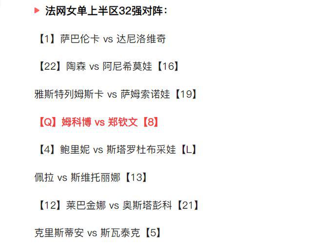 北京时间 5 月 29 日凌晨,法网女单第 2 第一轮比赛结束后,萨巴伦卡、莱巴金娜、雅斯特雷姆斯卡、陶森、克里斯蒂安和奥斯塔彭科同时晋级下一轮。到目前为止,32 强赛出 16 一个座位,包括1 萨巴伦卡号种子,4号 号种子鲍里妮,5 种子和卫冕冠军斯瓦泰克8号, 郑钦文号种子都在列。