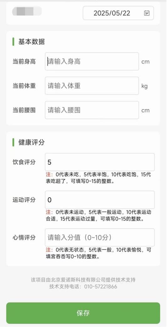体重和腰围可以记录实际值,体重以公斤计,腰围以厘米计,精确到小数点后, 1 位置。饮食、运动和情绪记录分数,可以是 0~15 它们之间的任何数字;对于数字的含义,不同的指标是不同的,电子日历上写得很清楚,一目了然。 ~