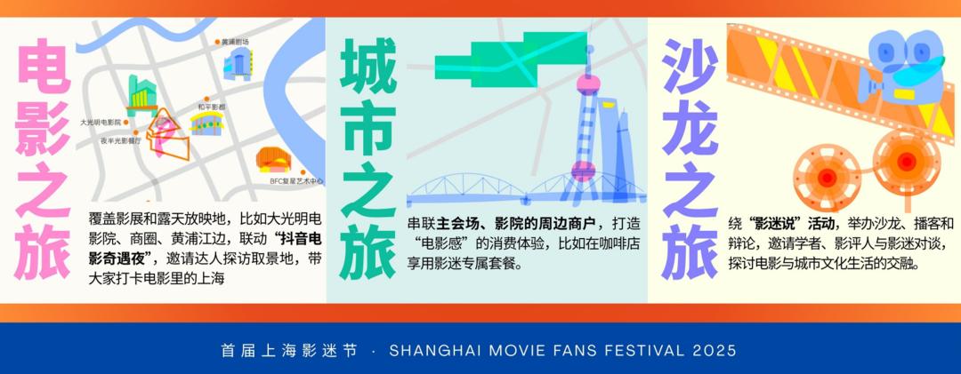精心策划三条主题路线:“电影之旅”连接大光明、和平电影等历史影院和外滩、南京路等户外放映点,还有“TikTok电影冒险之夜”等全上海冒险电影。 Walk活动让你亲自走进电影画面;“城市之旅”以会场为核心,辐射周边老字号店铺、线上名人咖啡馆等特色商家,感受交易中电影主题的互动体验,享受粉丝专属折扣。在屏幕前看到观众 “局外人” 成为城市消费者 “主角”,电影文化正以更烟火的方式激活城市经济的微循环系统;“沙龙之旅”连接了三个“粉丝说”活动。在这里,你可以和你的朋友聊聊电影、城市、美食和生活的有趣话题,参加生动精彩的沙龙讨论。