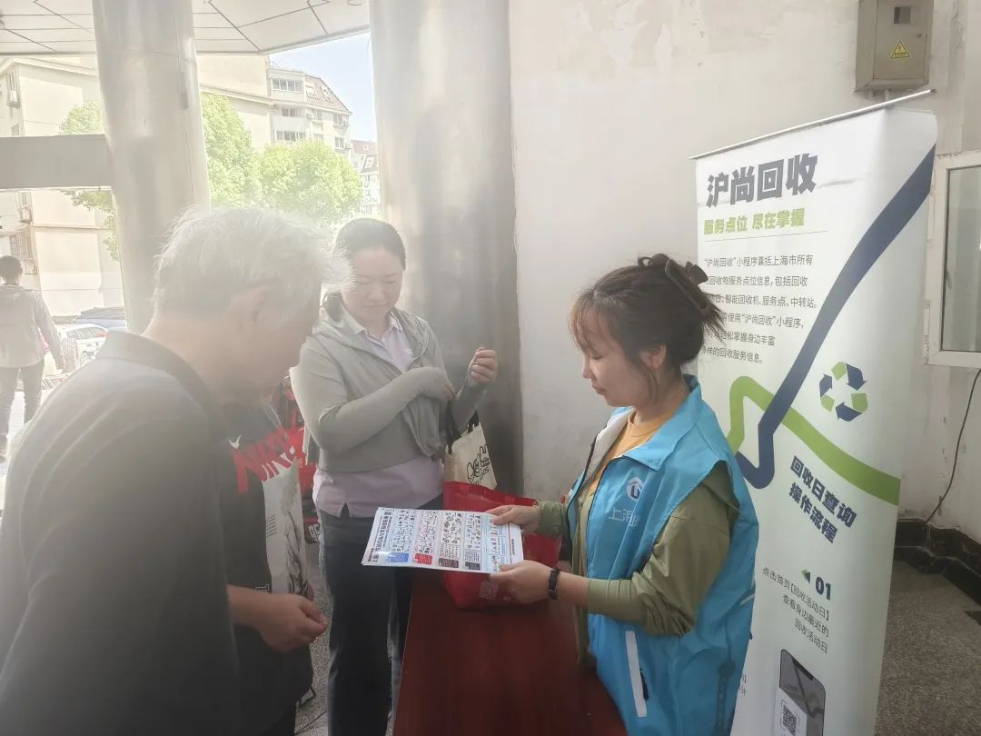 在名门花园、绿园、龙潭三个社区的垃圾分类、“尚沪回收”宣传现场,志愿者和“尚沪回收”工作人员通过设置摊位、互动回答问题、发放宣传页面等方式,向居民普及可回收材料的分类依据和资源利用价值。