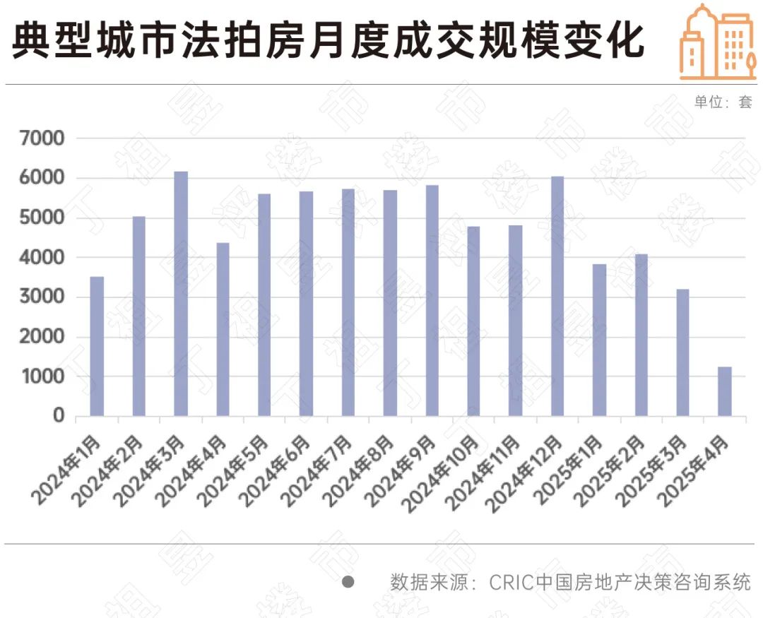 CRIC数据显示,自2025年以来,典型城市法拍房成交率普遍下降,不如2024年同期,2025年4月,典型城市法拍房成交量为1244套,比上年同期下降61%,比上年同期下降71%,创2024年至今月新低。