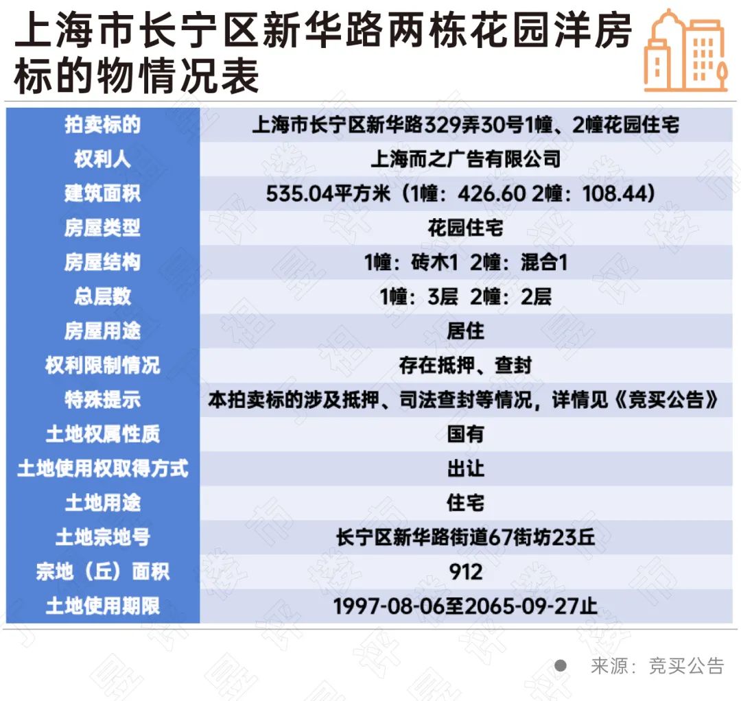 拍卖网站显示,该拍卖行为上海市长宁区新华路329弄30号1栋和2栋花园住宅,总建筑面积535.04平方米,其中一栋建筑地上三层,建筑面积426.6平方米,两栋建筑地上两层,建筑面积108.44平方米。