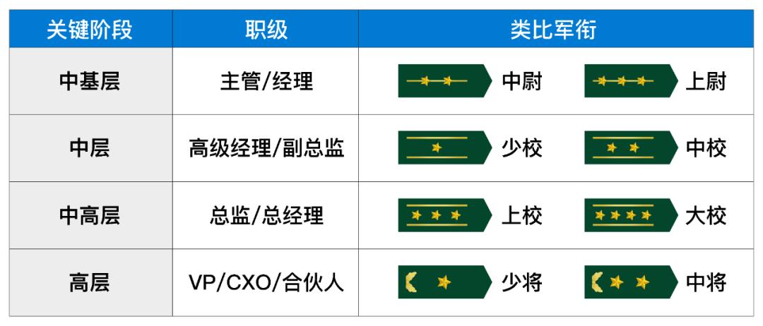 在高管发展的四个关键阶段,请让我用军衔来比较。