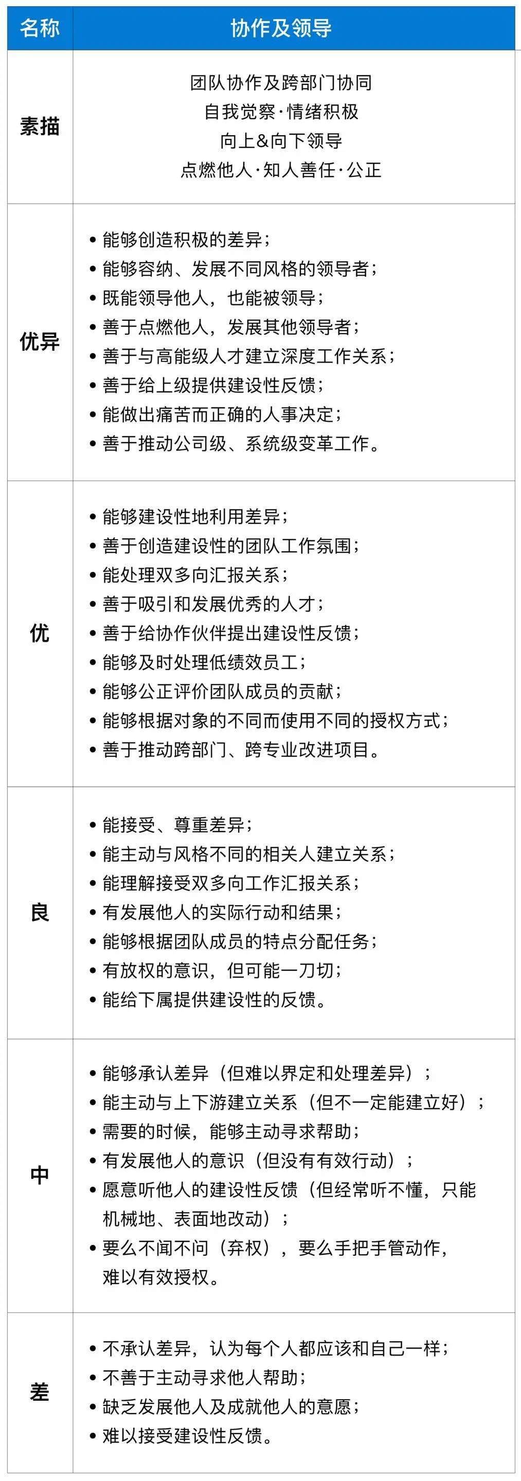 你可以看看下表中的标准。对合作和领导能力的良好需求不是很高。在一个组织中,如果你想承担中层以上领导的责任,你必须做到最好。所以这个标准并不苛刻,也没有说“不优秀就是问题”。